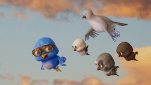 A determined blue bird, unlike his siblings, hilariously crashes through bold flying attempts, discovering heart and magic in finding his wings.